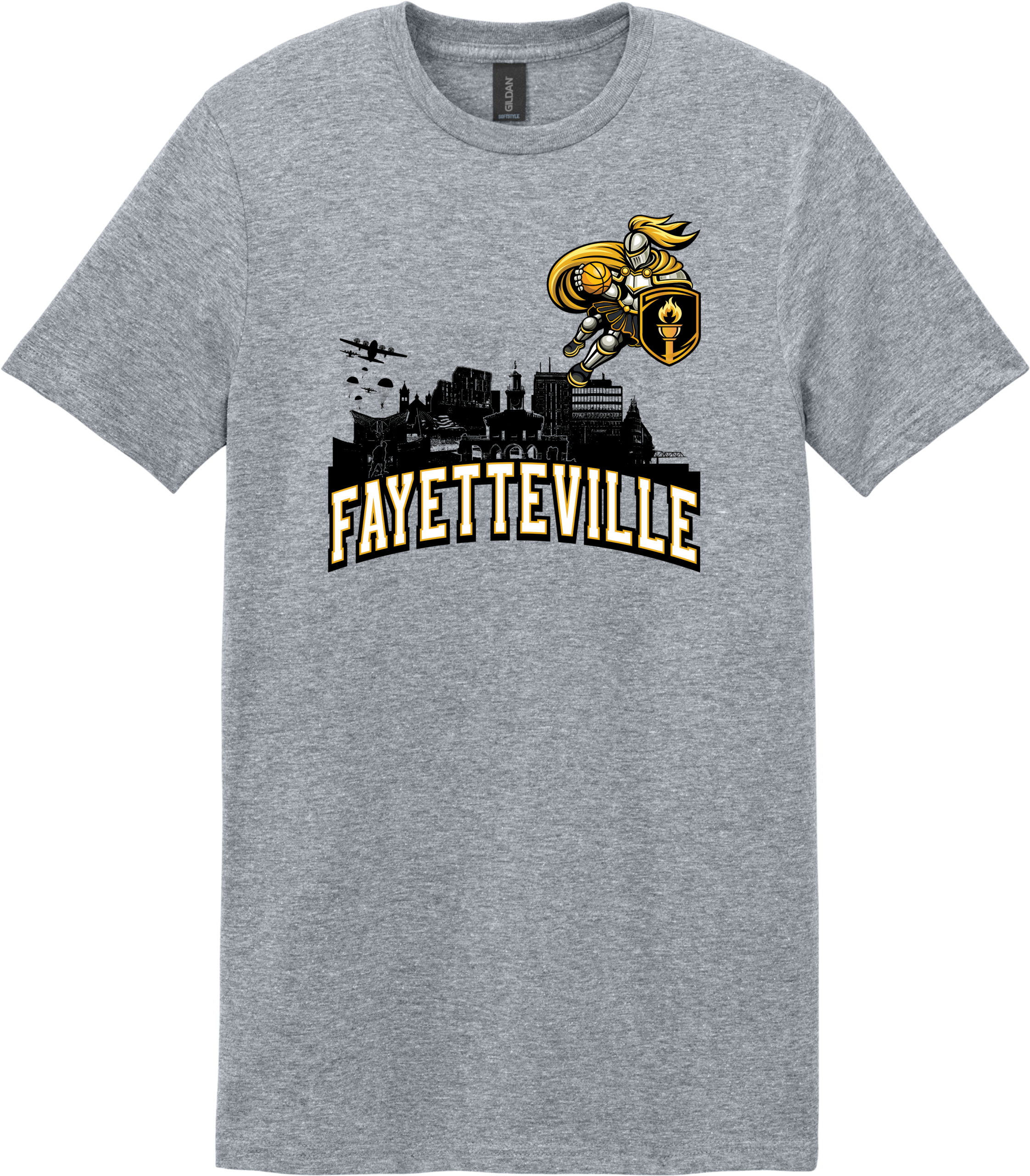 The Skyline Edition celebrates Fayetteville pride. Featuring the city silhouette paired with the Liberty knight emblem, this design connects community identity with basketball excellence.